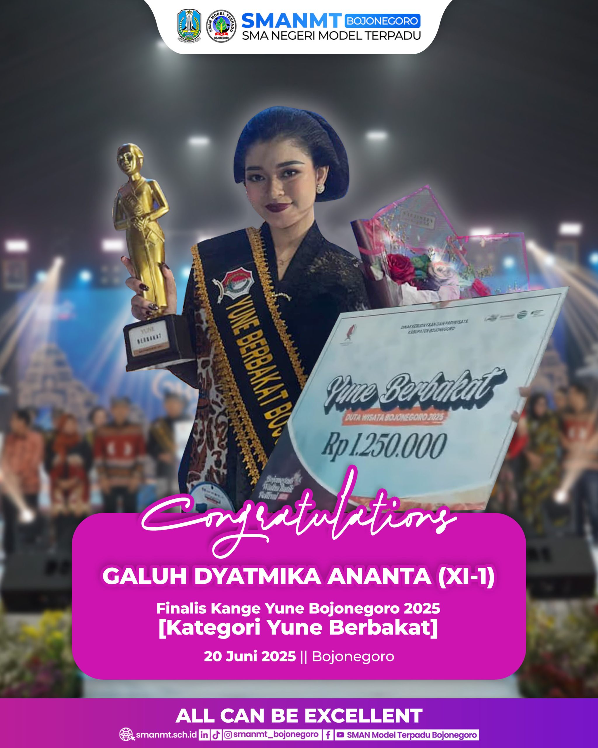Bojonegoro — Kabar membanggakan kembali datang dari SMA Negeri Model Terpadu Bojonegoro. Salah satu siswi terbaik, Galuh Dyatmika Ananta, berhasil meraih prestasi dengan menjadi Finalis Yune Berbakat Bojonegoro 2025, yang dilaksanakan pada 20 Juni 2025.