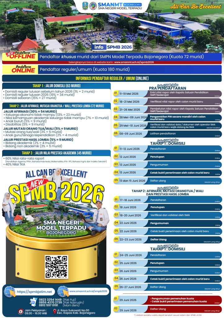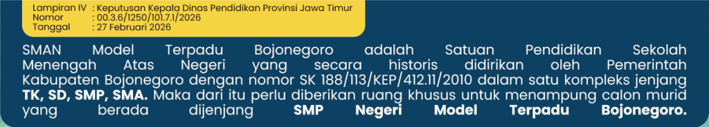 Sistem Penerimaan Murid Baru (SPMB) 2026 akan dilaksanakan serentak di Jawa Timur mulai bulan Juni 2026. SMAN Model Terpadu yang merupakan salah satu SMA Negeri di Bojonegoro turut melaksanakan SPMB 2026 sesuai dengan Juknis yang telah ditetapkan oleh Dinas Pendidikan Provinsi Jawa Timur tahun 2026.